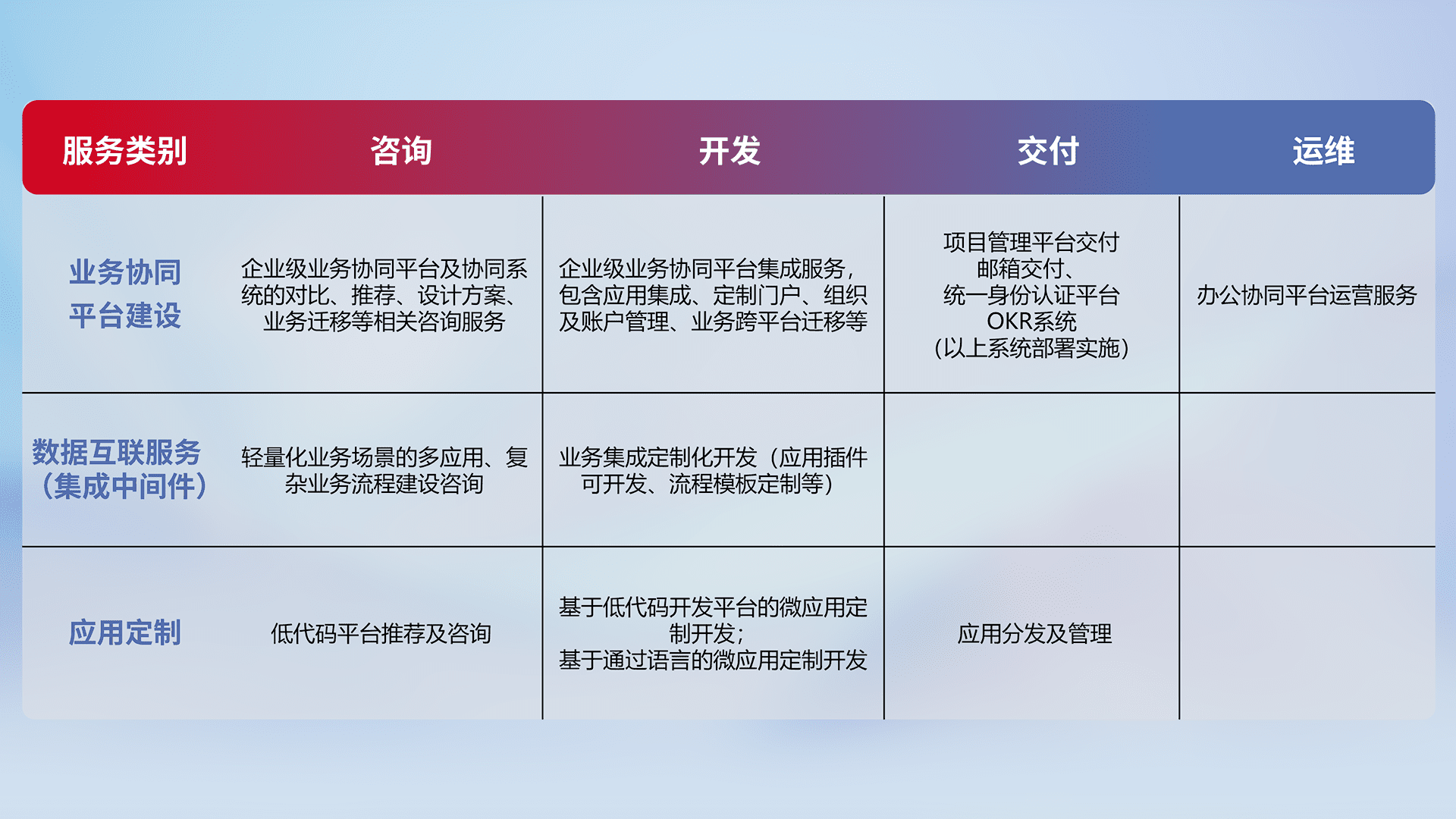针对钉钉、、、、企微、、、IDaas等平台级产品提供产品的规划、、、方案、、交付、、、、定制化开发等服务,,,实现如统一协同办公、、、、智能客户服务、、、、混合会议管理、、、智能数据查询、、等业务场景,,实现数字化转型。。
